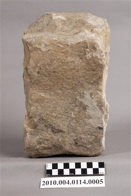 根據收藏來源資料,本文物疑為竹塹城石組2010.004.0114的一件,一組六件。竹塹城位於今新竹市,1828年到1829年改建為磚石城牆,城牆位置在今東門街、西門街、南門街、北門街。日本時代1906年起進行市區改正,將城牆陸續拆除成道路,城牆的磚石則用以築設下水道或作道路底面。本文物是位於北門街鄭用錫進士第前下水道邊的石塊。