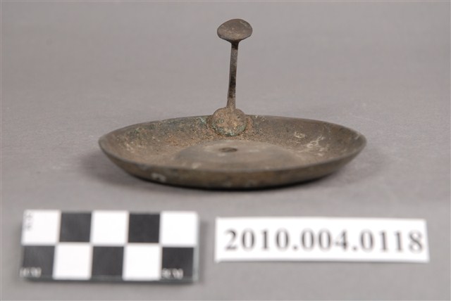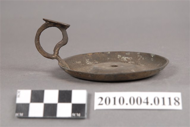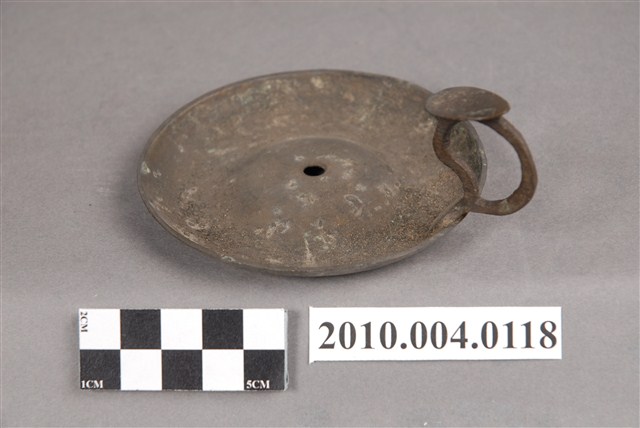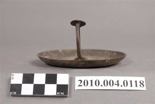 1.本件銅製蠟燭燈托通身以銅合金製作,外型呈上寬下窄口緣外侈的圓形淺碟,其中央處作略為突起,中心處帶有圓形透孔,應為原始燭籤設置處,現燭籤以佚失。燈托一側作環形提把,提把頂端另設計有圓形銅片,拿取燈托時可將手指按於圓片上,方便拿起。2.臺灣在電燈尚未普及的時代,係以蠟燭、電石、植物油與煤油等燃料作夜間照明使用。本件燈托為日常生活使用,形式較樸實,講究實用為主。