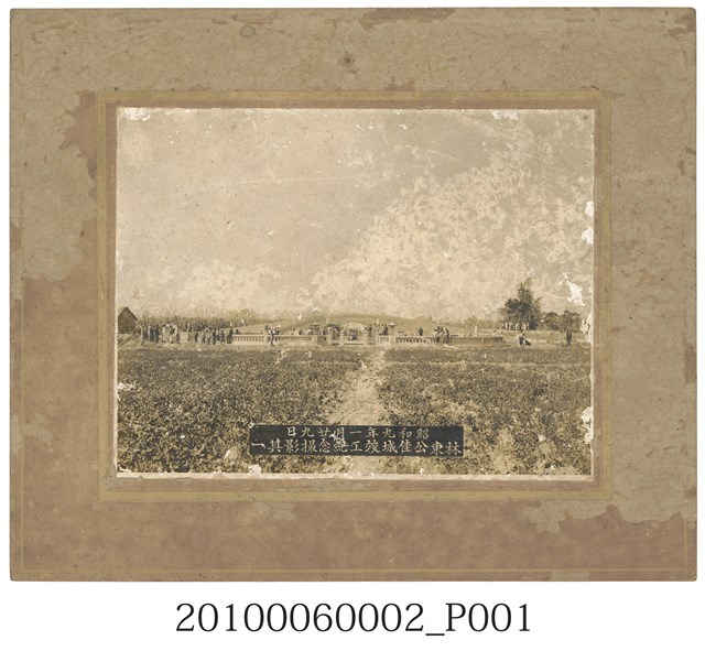 1.本物件為林東公佳城竣工紀念攝影照片其一,從照片中可看出此墳範圍廣大,外圍以矮牆欄杆圍住,中間有墓碑一座,照片中有照到許多人站於墳墓周遭,推測應為故人之家屬及親友。 2.林東為臺中仕紳,生於1862年,幼習漢學,從事農業及開墾,曾任臺中州烏日庄協議會員,歷任大小公職,信望殊高,為人溫順,鄉黨仰慕。