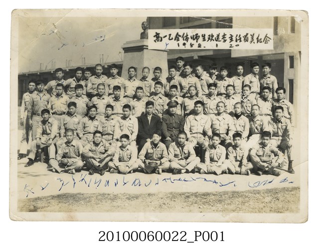 本件為臺灣省立臺中第一中學(今臺中市立臺中第一高級中等學校)歡送照,拍攝時間為民國47年(1958)1月20日,照片上方印有「高一乙全體師生歡送李主任留美紀念」、「1958. 1 20」字樣。