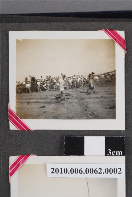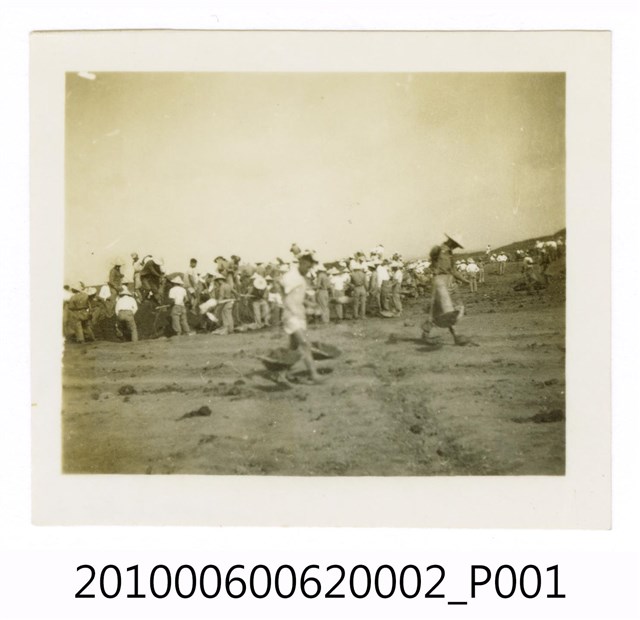1.本物件為黑白照片,場景為一片荒地,畫面為一群人在荒地裡幹活,有的挑扁擔,有的拿著鋤頭,且都頭戴斗笠。