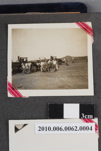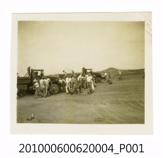 1.本物件為黑白照片,場景為一片荒地,畫面為一群人在荒地裡走動,各自提著東西,頭戴斗笠或帽子,後面有兩臺貨車。