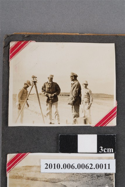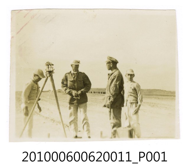 1.本物件為黑白照片,場景為一片平坦空曠的地面,畫面為四個穿著制服的人圍著一個腳架的工具,他們正在談話。