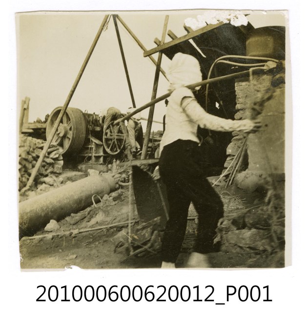 1.本物件為黑白照片,場景為工程一景,有個人正拿著工具在走動,後方有工程車輛。