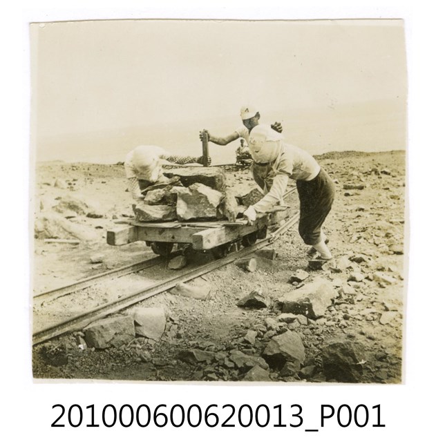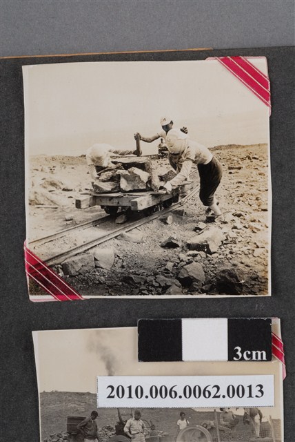 1.本物件為黑白照片,場景為工程一景,畫面為幾個人在一片荒地上推著在軌道上的木推車,此為人力輕便鐵道,車上載著一些石塊。