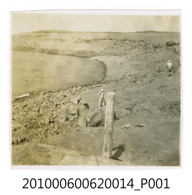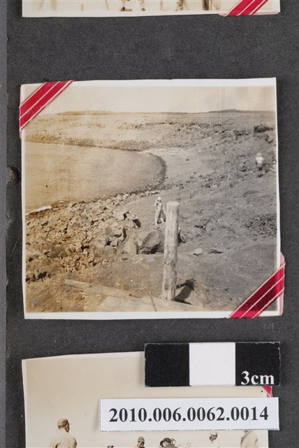 1.本物件為黑白照片,場景為工地一景,畫面為一片土石荒地,有幾個人正在進行工作,工地上還立了一根木頭柱。
