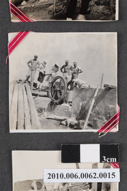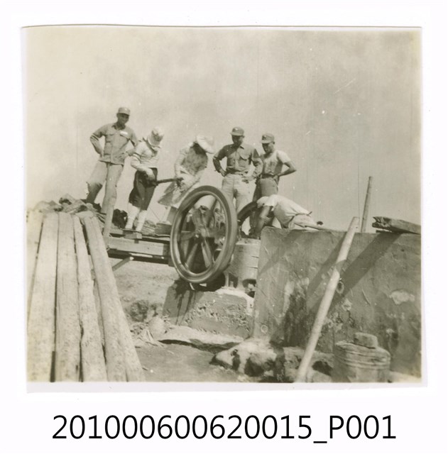 1.本物件為黑白照片,場景為工程一景,畫面為幾個人站在幾根木頭搭的檯子上在觀望東西,前方有一個大輪子。