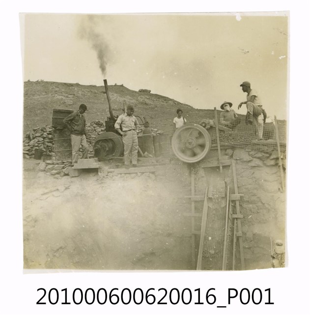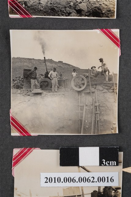 1.本物件為黑白照片,場景為工程一景,畫面為幾個人站在一片荒地上,身旁有一些工程用機具,後方為一土丘。