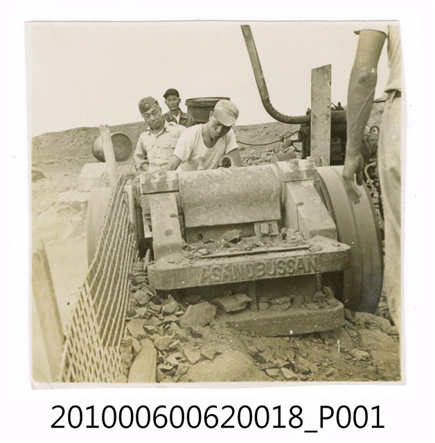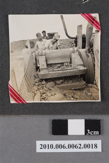 1.本物件為黑白照片,場景為工程一景,畫面中有人正在駕駛工程用機具,旁邊有人在看著,有的人穿著便服,有的人穿著制服。