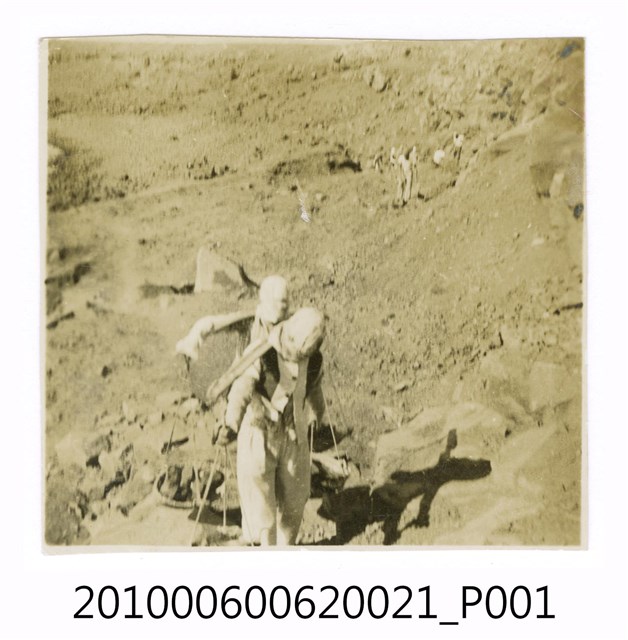 1.本物件為黑白照片,場景為工程一景,畫面中有些人在一片荒地中挑著扁擔,扁擔裡裝著石塊等。