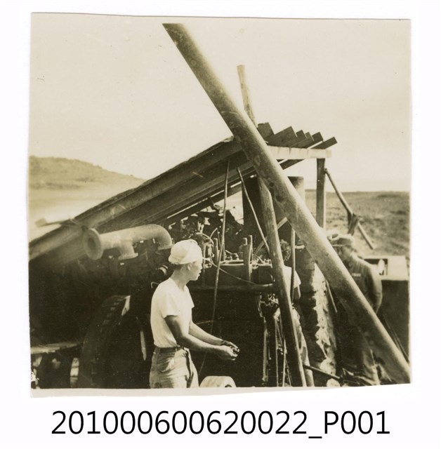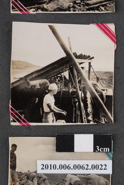 1.本物件為黑白照片,場景為工程一景,畫面中有工程用機具,及一些架著的骨架、木板等,前面站著一位工人正在進行工作。