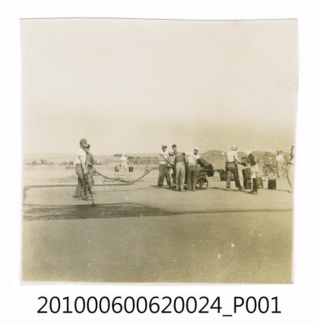 1.本物件為黑白照片,場景為工程一景,畫面中有工程用機具,有幾位工人正在使用機具進行工程作業。