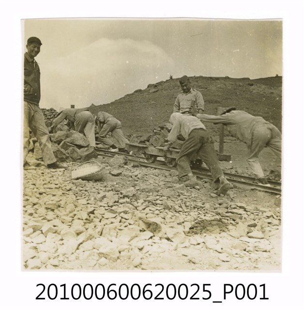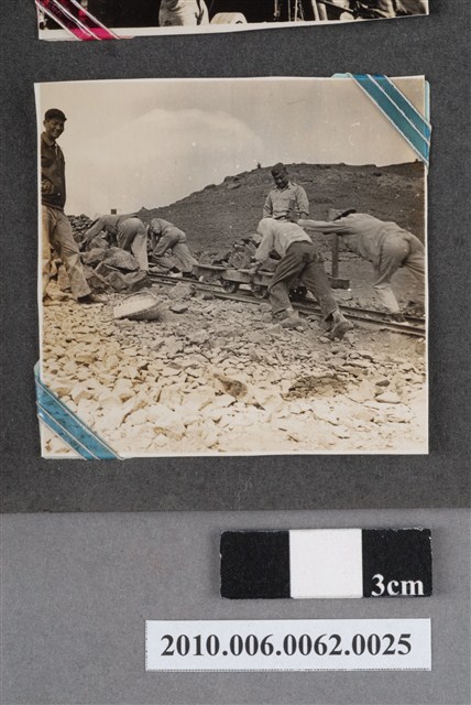 1.本物件為黑白照片,場景為工程一景,畫面中為一片土石地,有幾位工人正在推軌道上的板車,此為人力輕便鐵道,旁邊有穿著制服的人在看著。