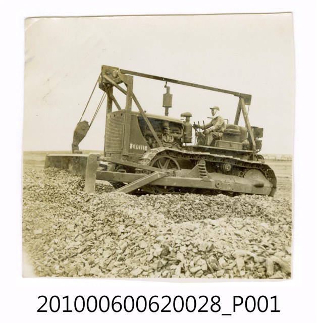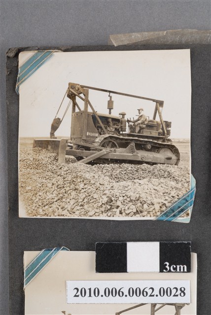 1.本物件為黑白照片,場景為工程一景,畫面中為一片土石地,有位工人正在使用工程用器具進行挖土石作業。