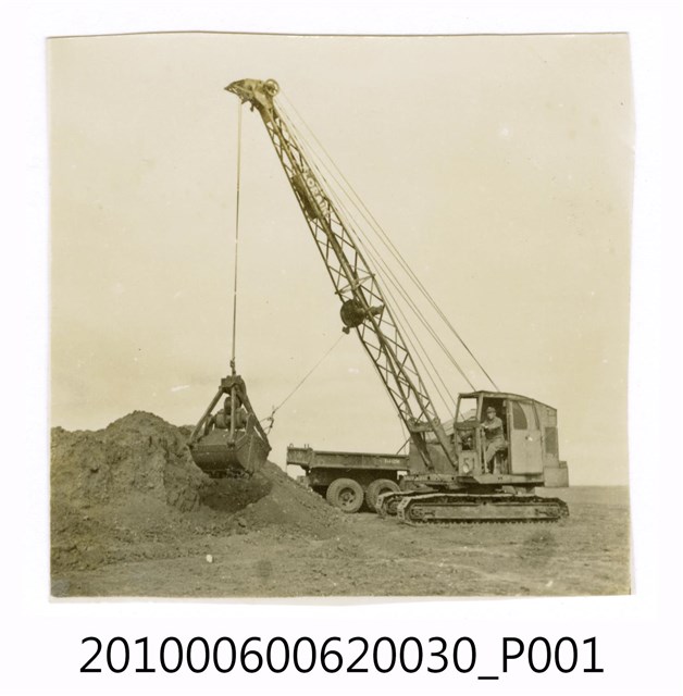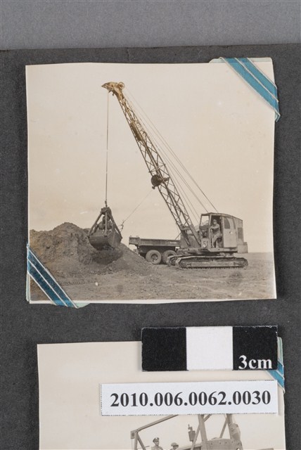 1.本物件為黑白照片,場景為工程一景,畫面中為一個土石地及工程器具,有位工人正在使用工程用器具進行作業。