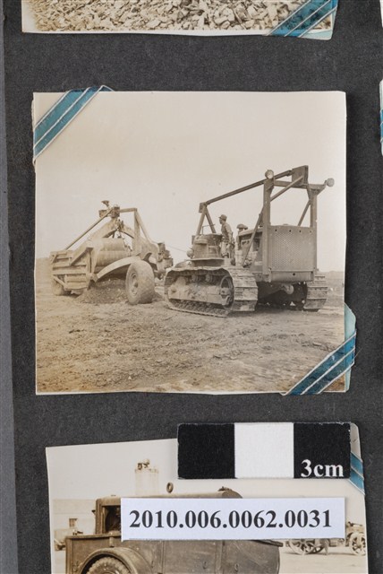 1.本物件為黑白照片,場景為工程一景,畫面中為一片土石地及工程器具,有位工人正在使用工程用器具進行作業。