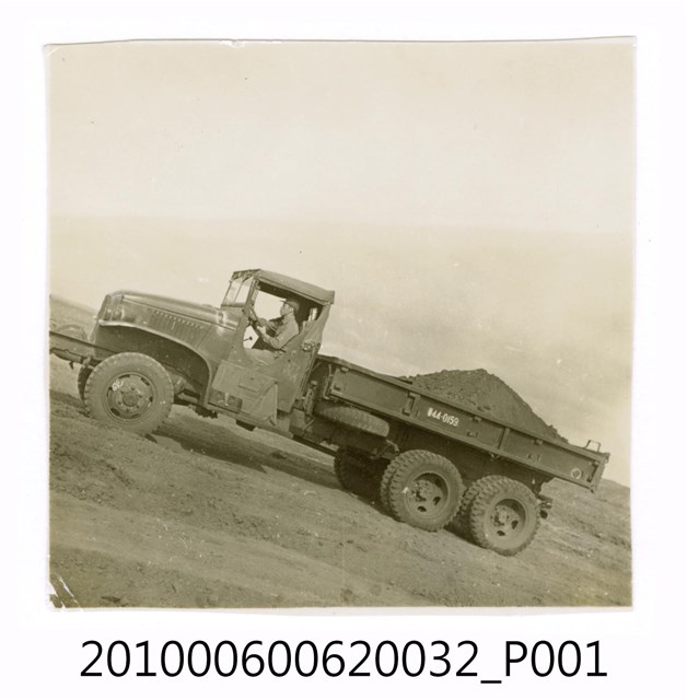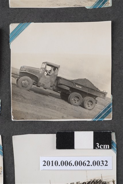 1.本物件為黑白照片,場景為工程一景,畫面中為一片土石地及貨車,有位工人正開著貨車載著土石進行工程作業。