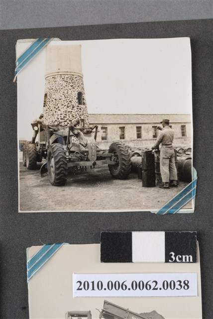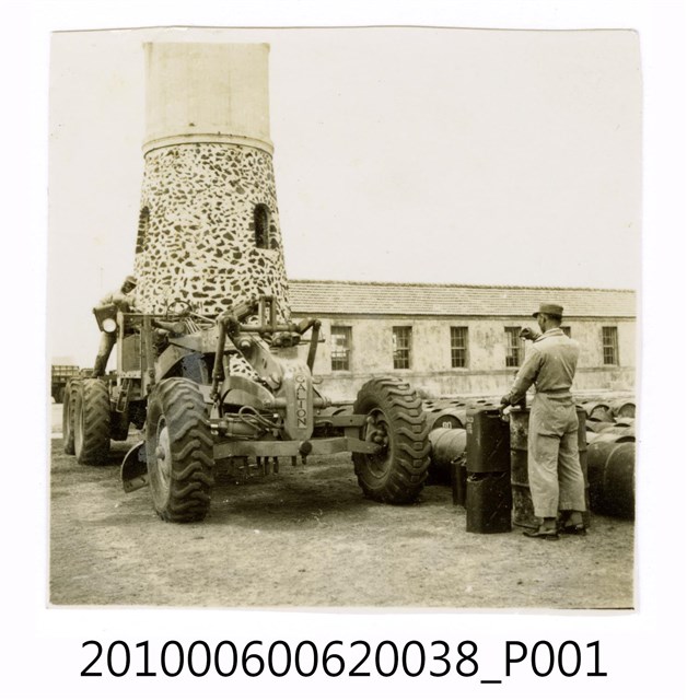 1.本物件為黑白照片,場景為工程一景,畫面中為一片土石地,後方有一棟建築,有個穿著制服的人正站在工程用車上,前方有位穿著制服的人正在使用工程用機具。