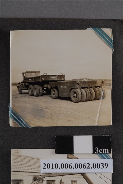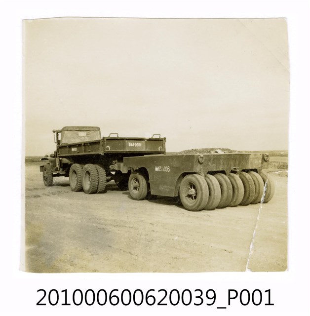 1.本物件為黑白照片,場景為工程一景,畫面中為一個土石地,有輛工程用貨車拖著一輛有很多輪子的工程用機具,機具上載了砂石。