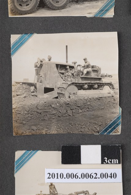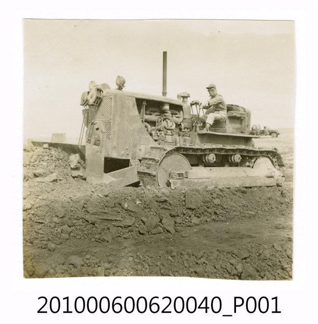 1.本物件為黑白照片,場景為工程一景,畫面中為一片土石地,有位穿著制服的人正在駕駛輪胎為履帶的工程用機具。
