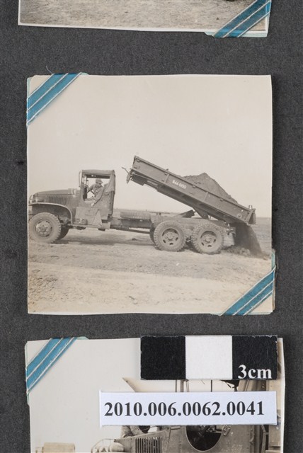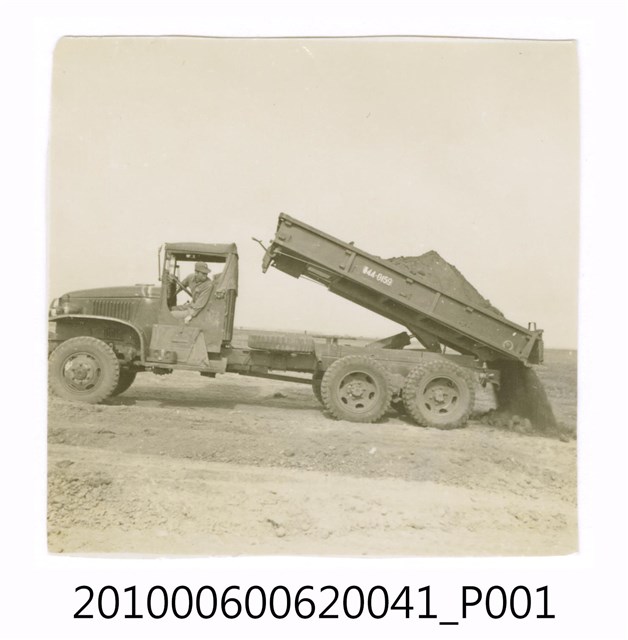 1.本物件為黑白照片,場景為工程一景,畫面中為一片土石地,有位穿著制服的人正在駕駛輪胎為6顆的工程用機具,機具正在倒出砂石。