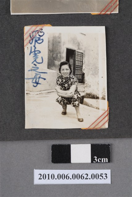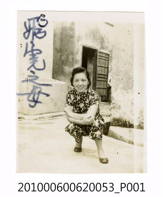 1.本物件為黑白照片,場景為一棟建築前面,畫面為飛□之母的獨照,她正雙手抱手肘的蹲在路面上,照片右上角以藍筆寫著「飛□之母」(編按:□字疑為「虎」字)。