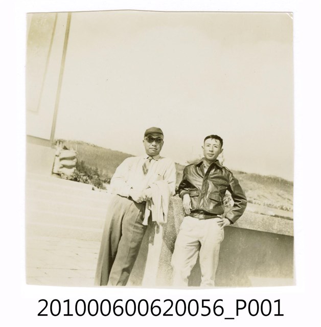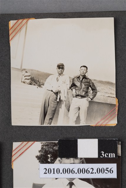 1.本物件為黑白照片,畫面中兩個男子靠在石牆上合照,左邊那位穿著西裝戴著帽子及墨鏡,右邊那位穿著皮夾克。