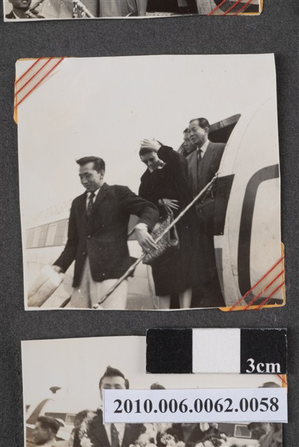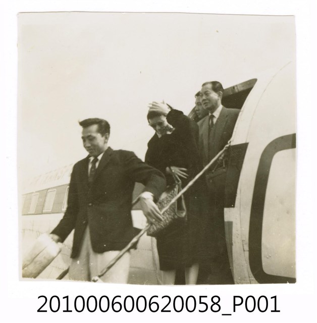 1.本物件為黑白照片,畫面中幾個人正要下飛機,第一位男子穿著西裝,第二位女子穿著大衣,第三位男子也穿著西裝。