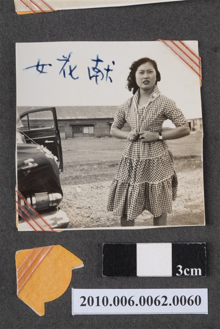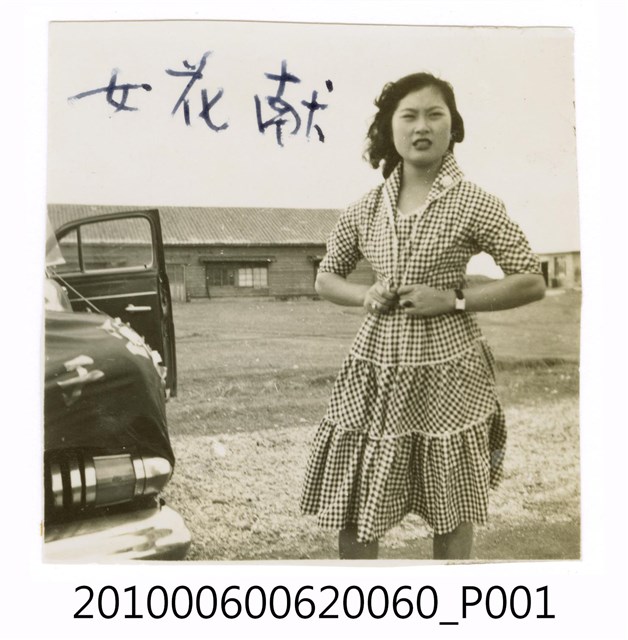 1.本物件為黑白照片,場景為一棟建築前面的土石地,畫面為一位穿著洋裝的女子站在汽車旁的獨照,照片右上角用藍筆寫了3個字為「獻花女」。