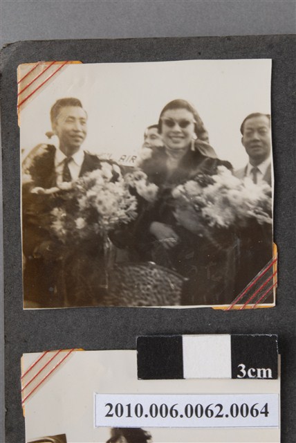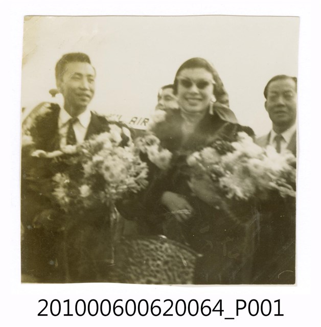1.本物件為黑白照片,場景為飛機旁邊,畫面中幾個人剛下飛機正在合影,他們手上各拿著花束,旁邊還有幾個人。