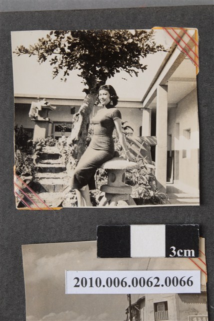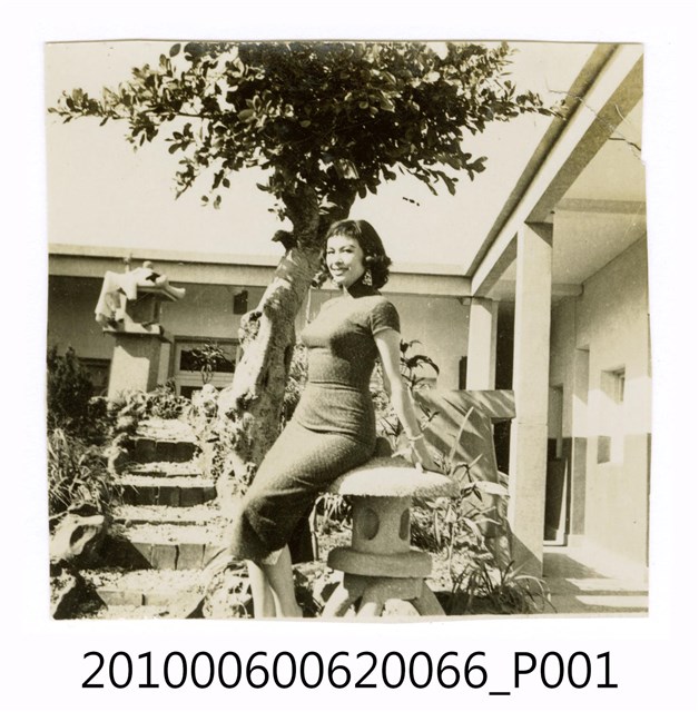 1.本物件為黑白照片,場景為建築物中的庭園,畫面中一位穿著洋裝的女子靠在石燈籠上獨照,後面有棵樹木及一些草叢。