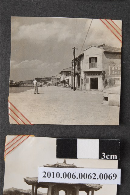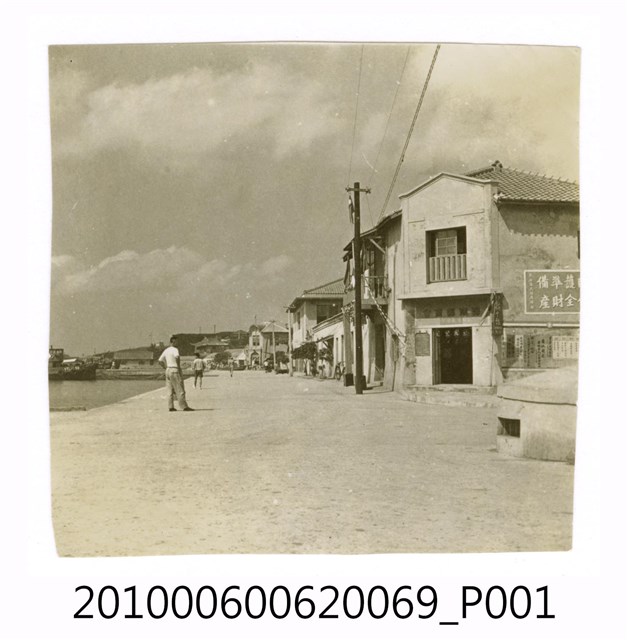 1.本物件為黑白照片,場景為碼頭邊的一排房屋及街道,畫面中有幾個人站在碼頭的路邊。