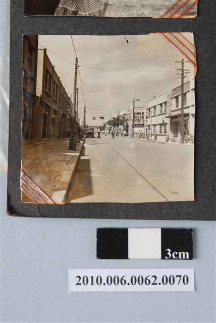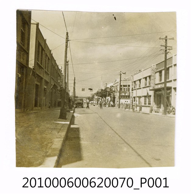 1.本物件為黑白照片,場景為街道景色,馬路兩旁有兩排房屋及電線杆,街上有幾個人及車輛。