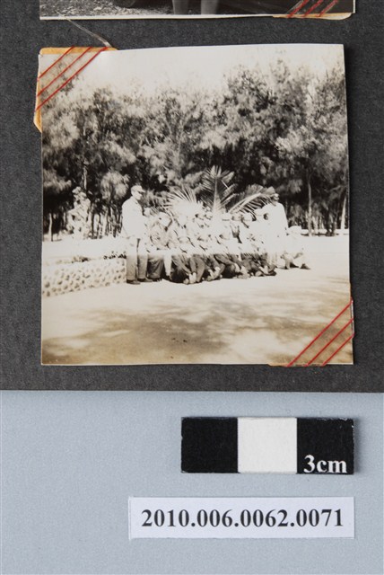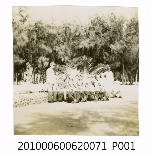 1.本物件為黑白照片,畫面為一群人的合照,中間一排人坐著,旁邊兩個人站著,後面為一片樹林。