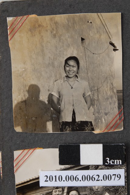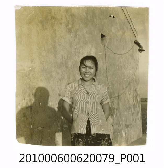 1.本物件為黑白照片,畫面為一位女性單獨獨照,她手背背後站在一片石墻旁邊。