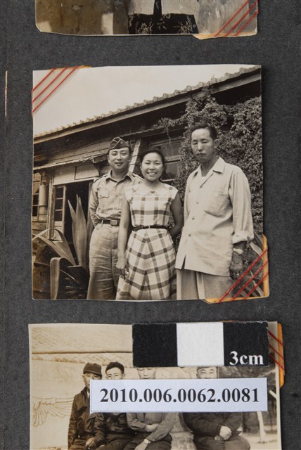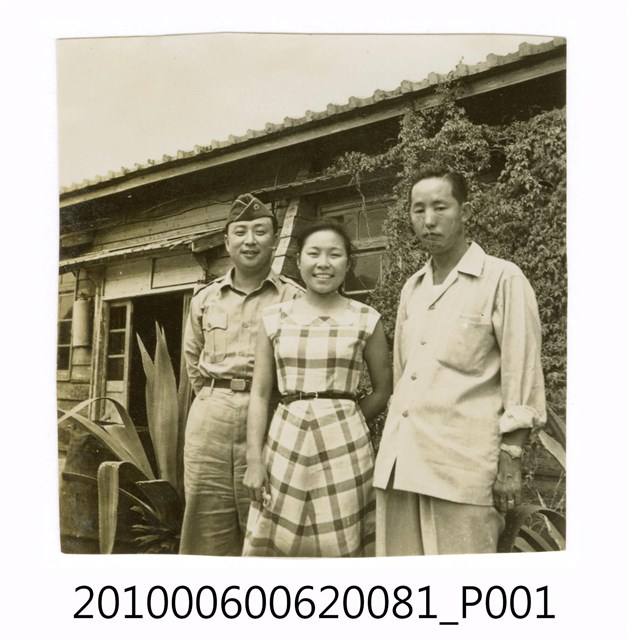 1.本物件為黑白照片,畫面為兩男一女合照,中間的女子穿著洋裝,左邊的男子穿著制服,右邊的男子穿著襯衫,他們身後為一棟房屋,房屋牆壁上爬滿植物。