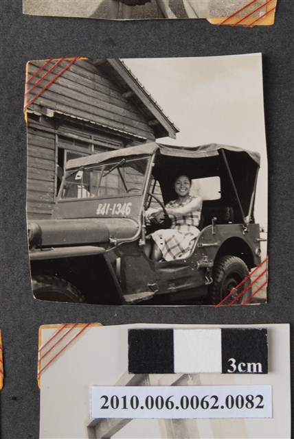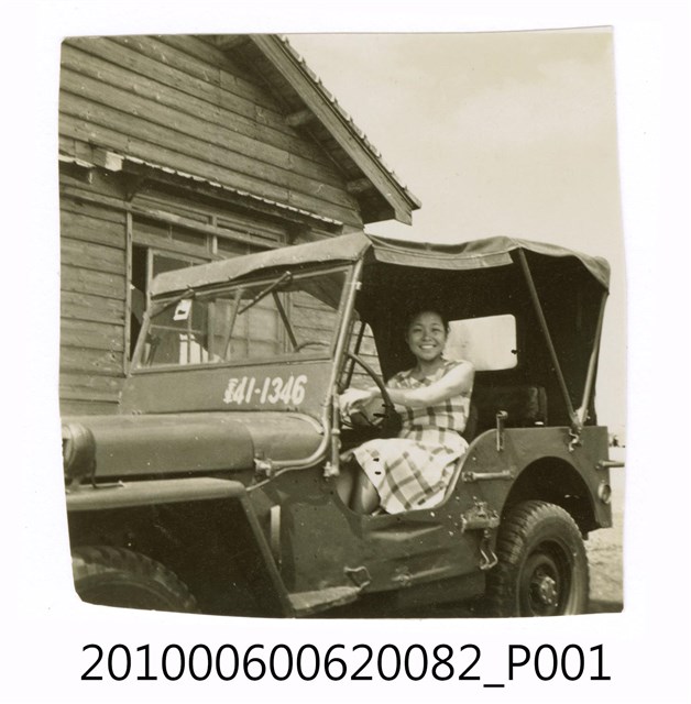 1.本物件為黑白照片,畫面為一位女生的獨照,女生穿著洋裝握著類似吉普車車子的方向盤,後面為一棟房屋。