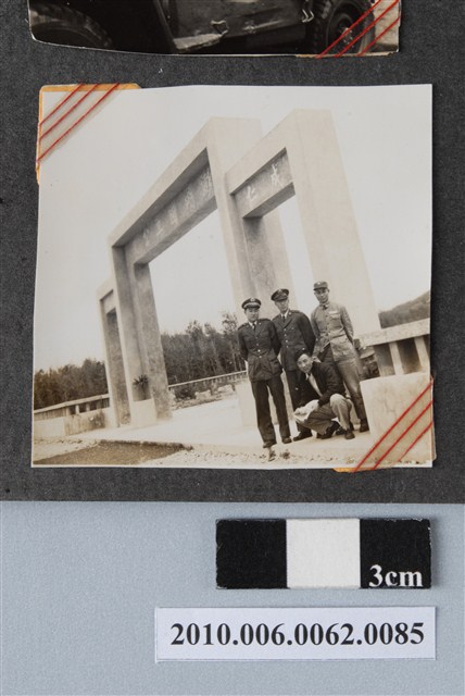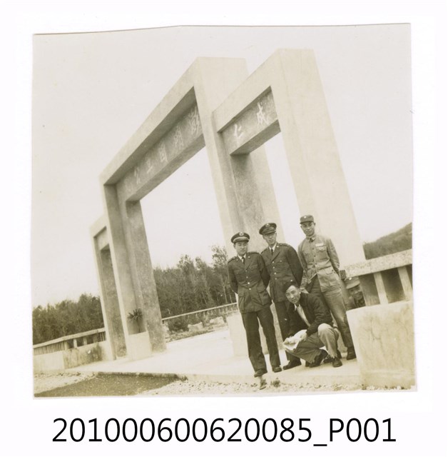 1.本物件為黑白照片,場景為澎湖國軍公墓,畫面為四人合照,三位站著的男生穿著制服,蹲著的男生穿著外套,後面為澎湖國軍公墓的牌樓及一片樹林。