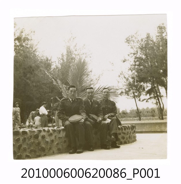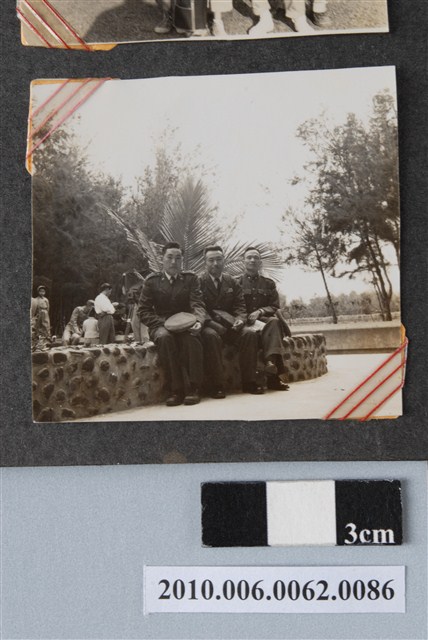 1.本物件為黑白照片,畫面為3位男子的合照,他們坐在一個石椅上,皆穿著制服,後面有一些人及樹木。