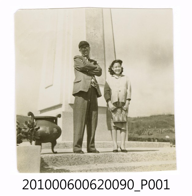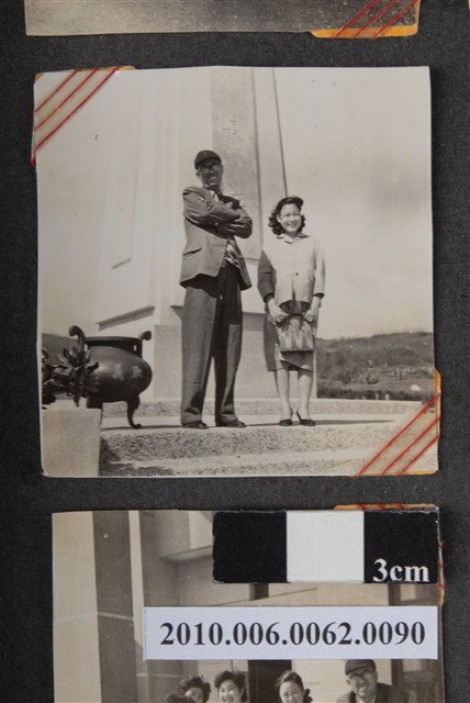 1.本物件為黑白照片,畫面為一男一女合照,女生穿著裙子拿著包包,男生雙手抱胸穿著西裝外套,後面為一個石雕物體。