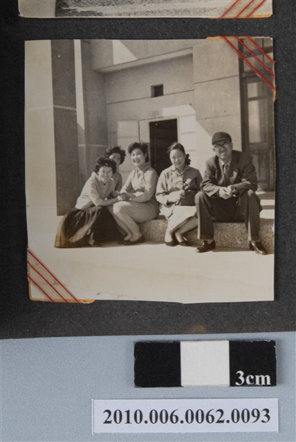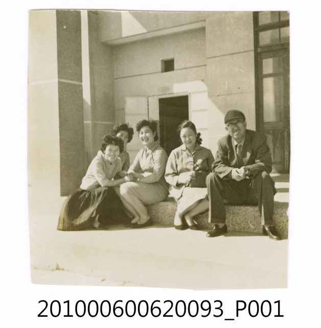 1.本物件為黑白照片,畫面為四女一男的五人合照,前面三位女子皆穿著裙子,後面一位女子臉稍微被擋住,男子穿著西裝,他們坐在一棟房屋前的石階上。