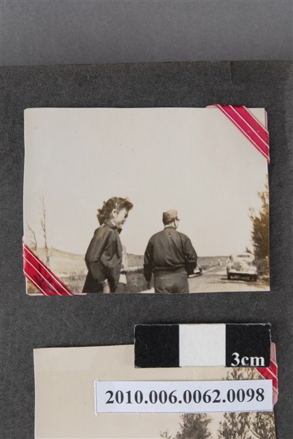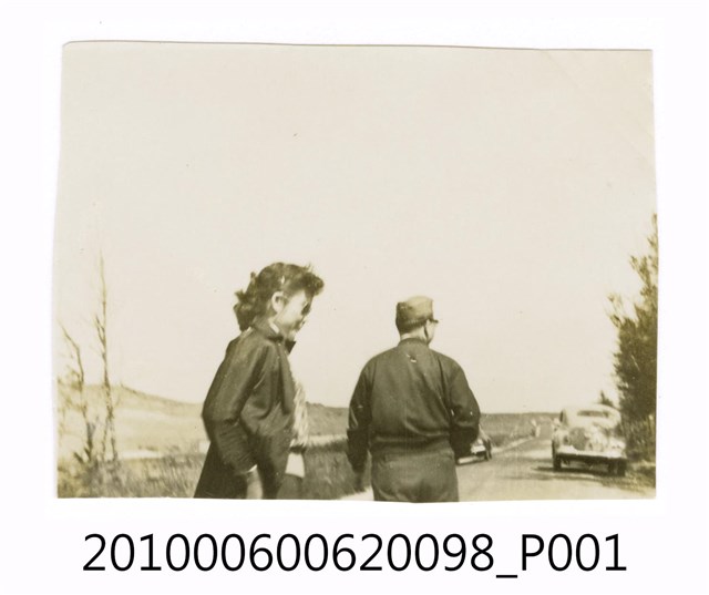 1.本物件為黑白照片,畫面為一男一女走路的照片,他們走在一條馬路上,路旁有一些停著的車輛及樹木。