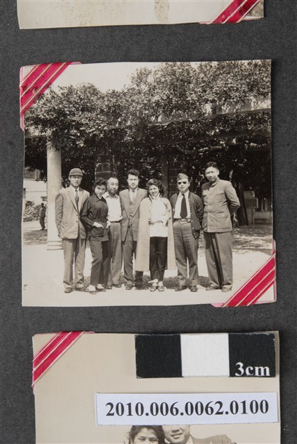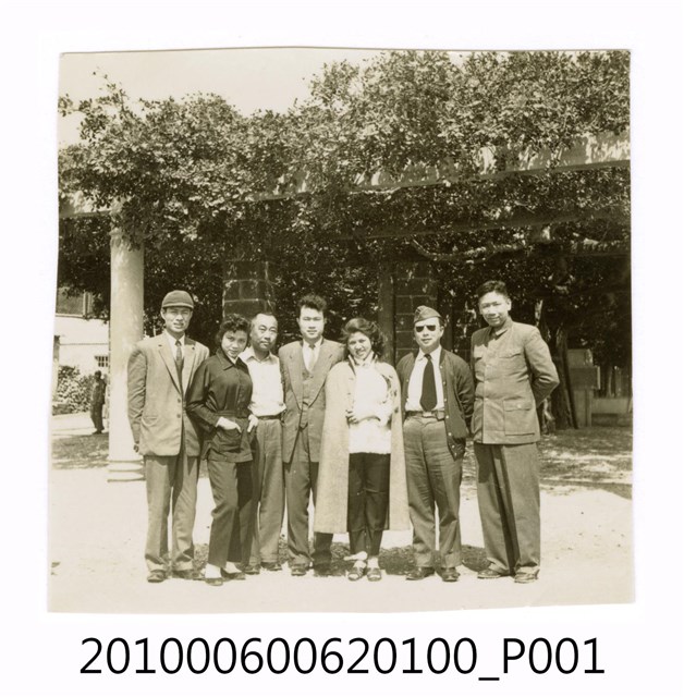 1.本物件為黑白照片,畫面為2女5男的合照,男生皆穿著襯衫,女生皆穿著外套及褲裝,他們後面為一些樹木。