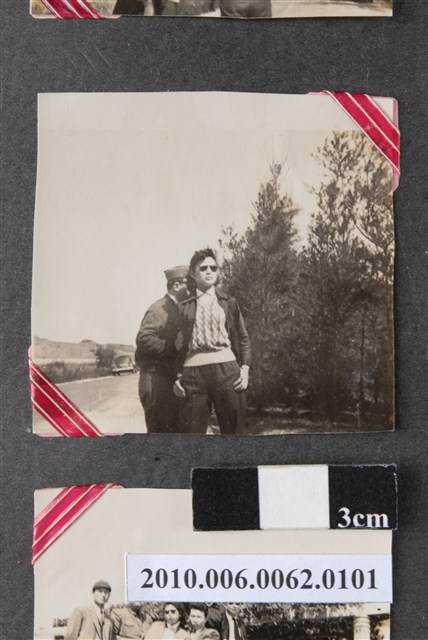 1.本物件為黑白照片,畫面為一男一女在路上的照片,男子站在女子身後,後面的馬路上停著車輛,路邊有一片樹林。