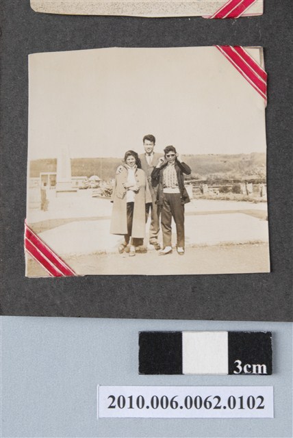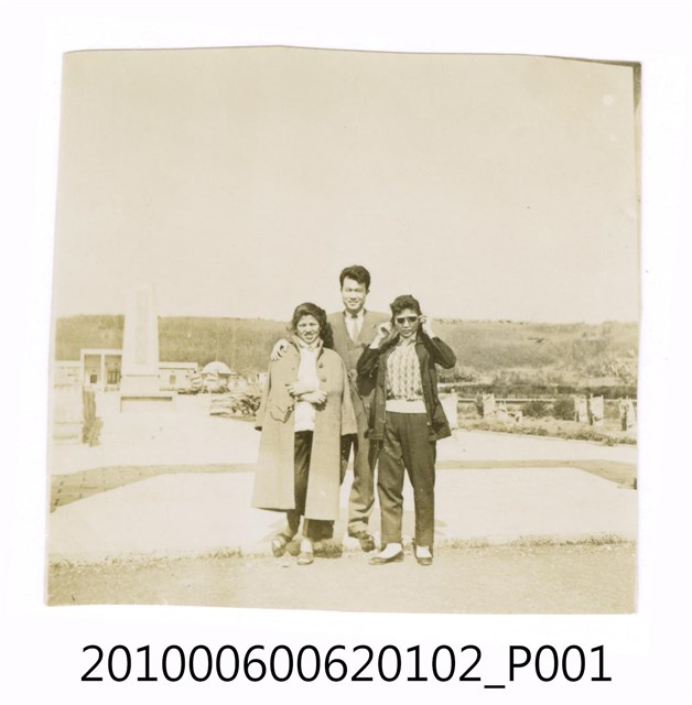 1.本物件為黑白照片,畫面為兩女一男的合照,三人皆穿著外套及褲子,右邊的女子戴著墨鏡,後面有一些草叢。