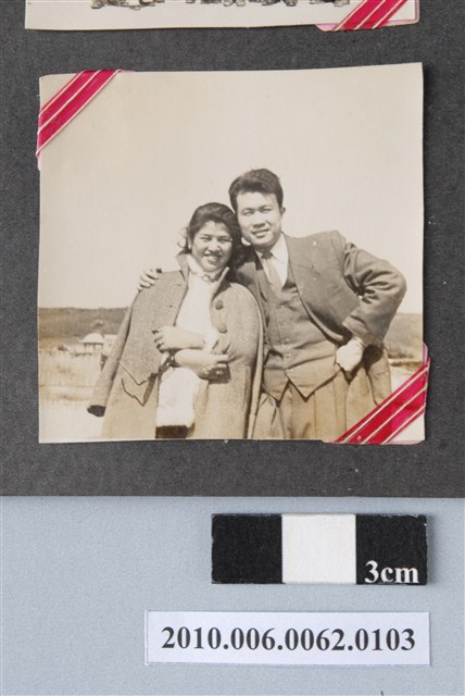 1.本物件為黑白照片,畫面為一男一女合照,他們皆穿著外套,男子一手插腰一手搭著女子的肩膀。