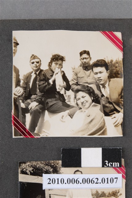 1.本物件為黑白照片,畫面為兩女四男合照,最左邊的男子被照片切去一半,有一位男子戴著墨鏡,一位男子戴著眼鏡,後方有樹木。