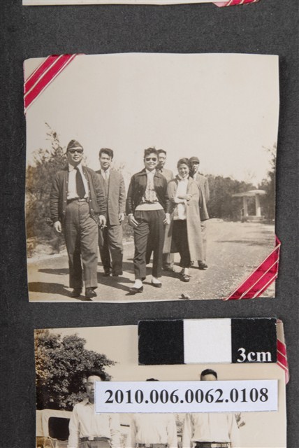 1.本物件為黑白照片,畫面為兩女四男合照,他們站在一條路上,最左邊的男子戴著眼鏡,中間的女子也戴著墨鏡,後方有亭子及樹木。