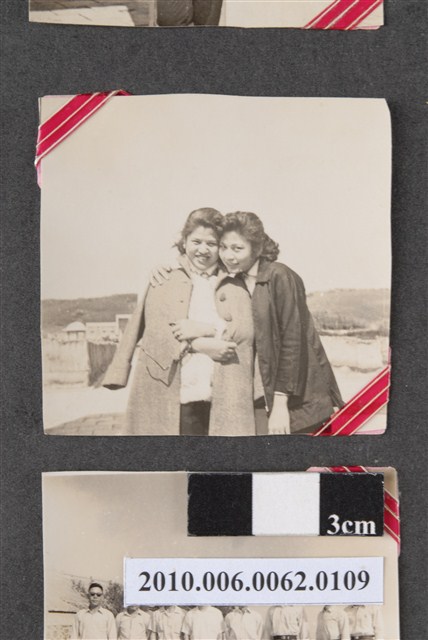 1.本物件為黑白照片,畫面為兩女合照,右邊的女子手搭著左邊女子的肩膀,她們皆穿著外套,後面有些建築及草叢。
