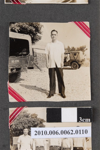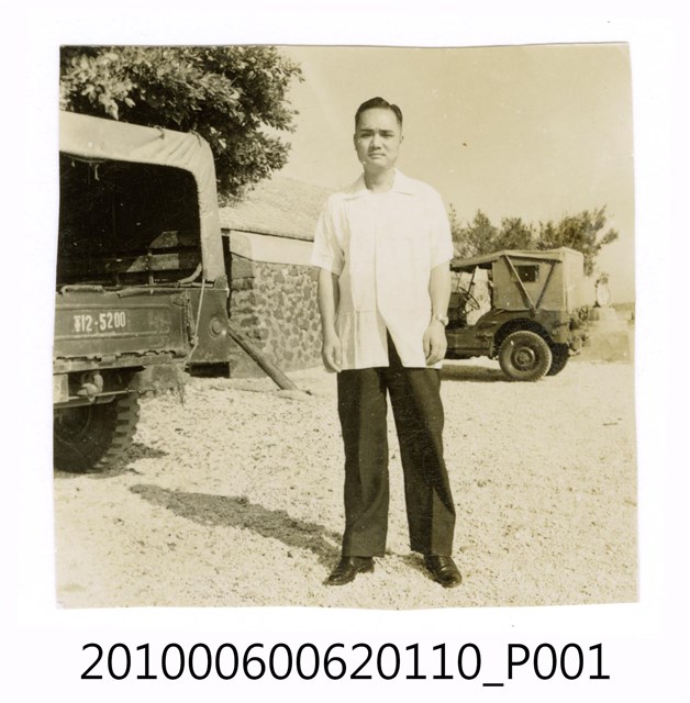1.本物件為黑白照片,畫面為一位男子獨照,他穿著白色上衣黑色褲子,後面有房屋、樹木及兩輛車。